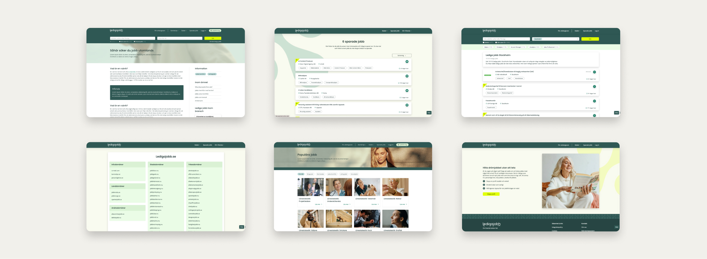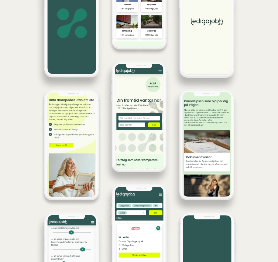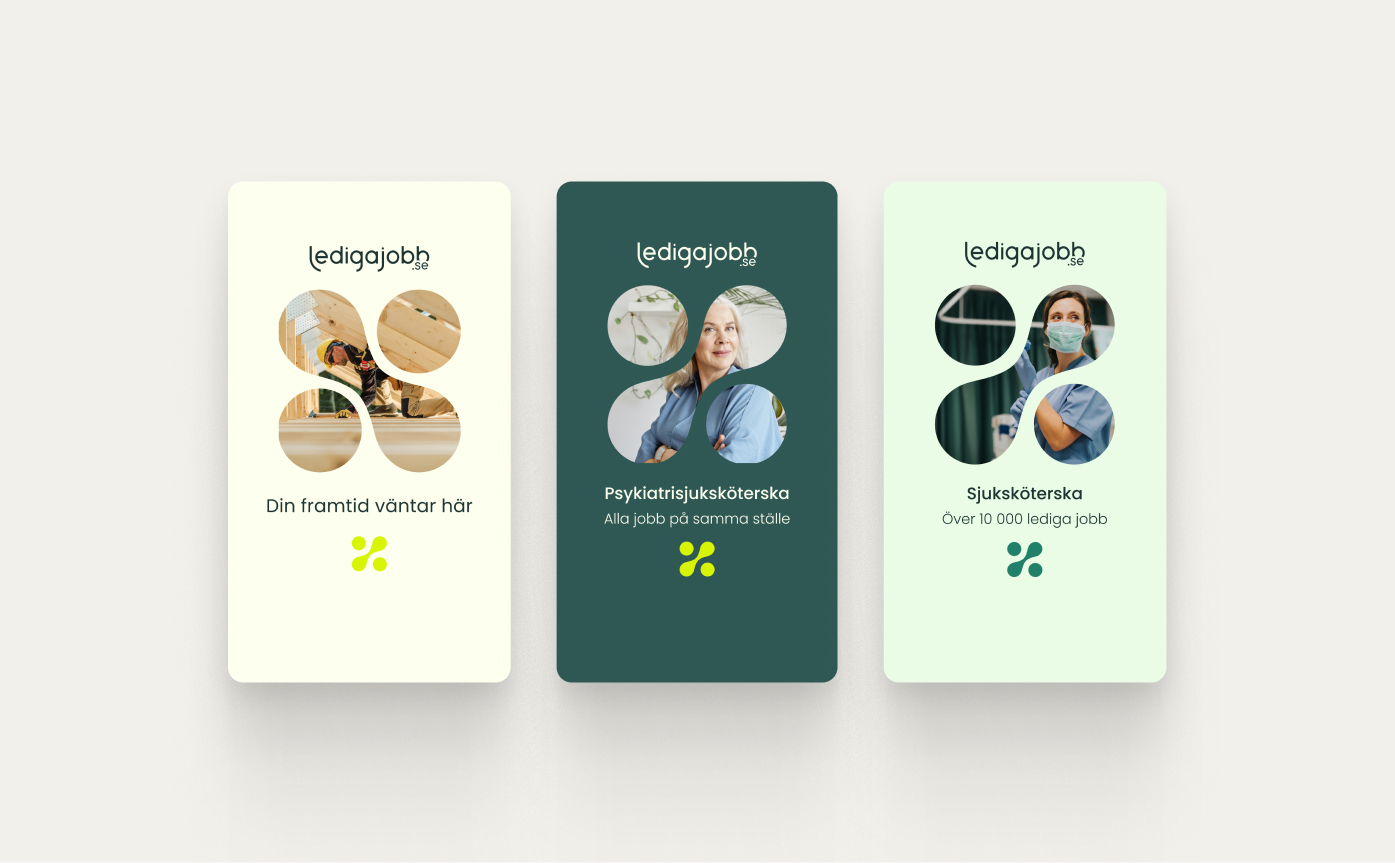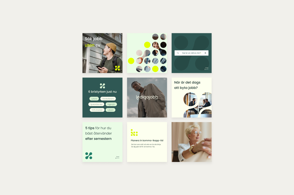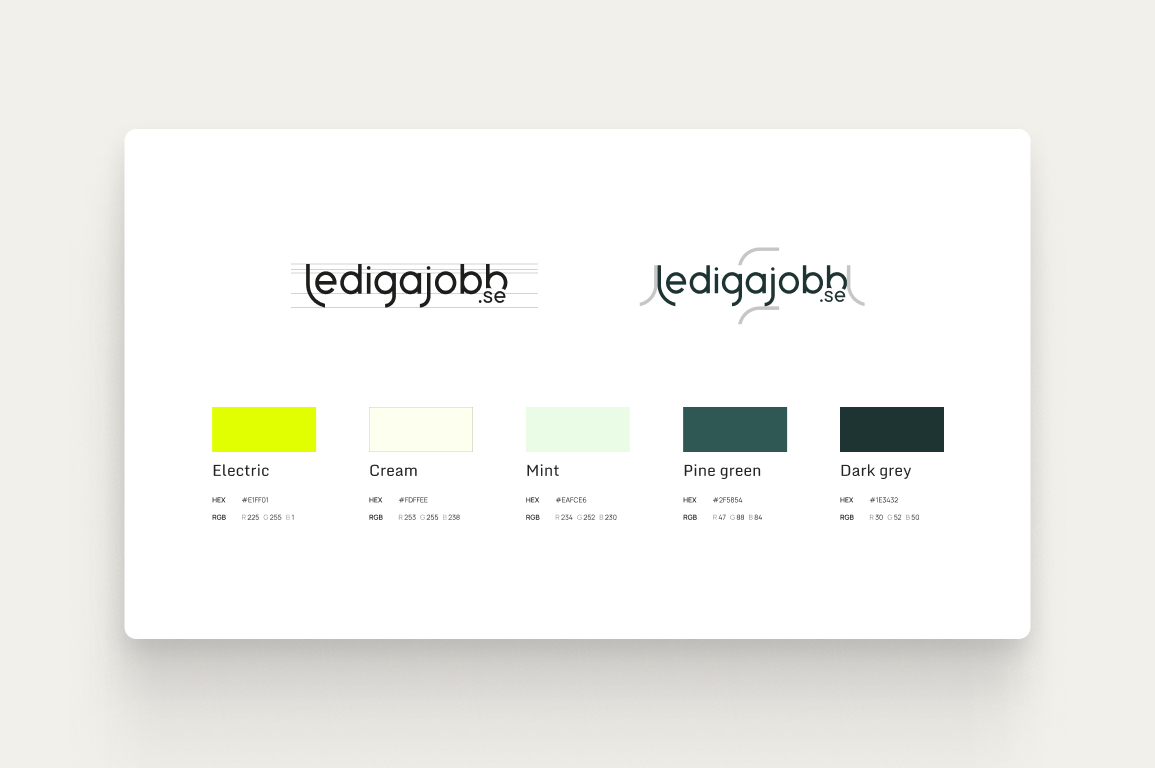 Ledigajobb.se upplevde sin tidigare profil som föråldrad och efterfrågade en levande och trovärdig framtoning som speglade deras framtidsvision. Detta åstadkom vi genom en minimalistisk design i mörkgrönt, med accenter i livfullt gult och fräscht ljusgrönt, som signalerar både modernitet och förtroende. Logotypen ger ett varmt intryck med sina runda former och designen lyfter fram kopplingen mellan arbetssökande och företag.